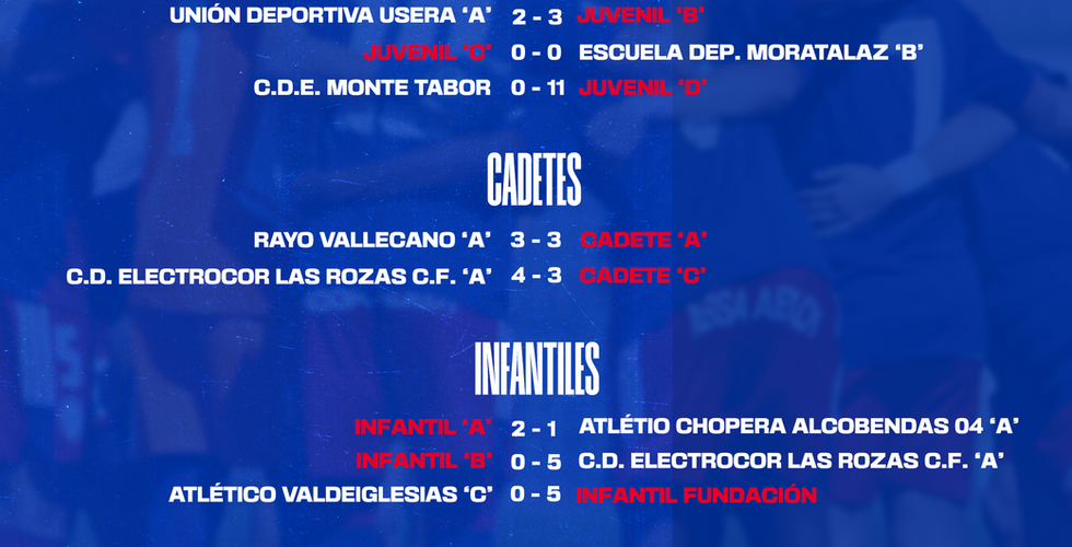 Os presentamos los resultados del fin de semana del 14 al 15 de enero de nuestras categorías inferiores. Esta semana destacamos las grandes victorias de nuestro Benjamín Fundación ‘A’ por 16-1 ante el F.C. Villanueva del Pardillo 'B' y de nuestro Benjamín Fundación 'C' por 0-16 frente al E.F.M.O Boadilla 'E''.