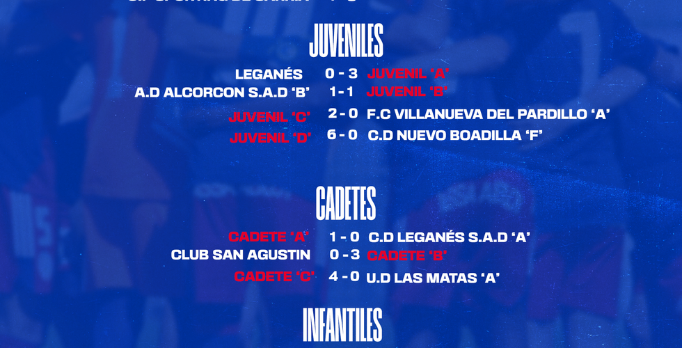 Os presentamos los resultados del fin de semana del 17 al 18 de diciembre de nuestras categorías inferiores. Esta semana destacamos las grandes victorias de nuestro Juvenil 'D' por 6-0 ante el C.D Nuevo Boadilla 'F' y de nuestro Alevín 'D' F7 por 1-15 frente al E.F.M.O Boadilla 'C'
