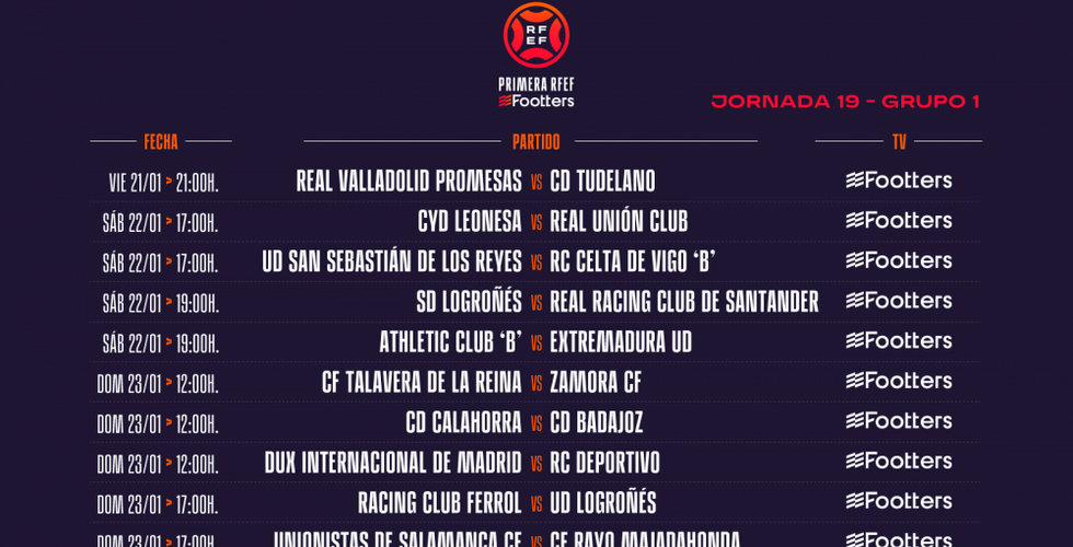 La Real Federación Española de Fútbol ha anunciado los horarios para los partidos correspondientes de las jornadas 17, 18 y 19 de Primera RFEF Footters: